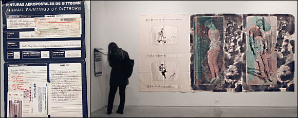 Eugenio Dittborn "Taciturna" (recent and non-recent airmail paintings) at Alexander and Bonin, 132 Tenth Avenue (Chelsea) Oct 29 - Dec 5 '98The airmail painting has been Dittborn's primary occupation since 1984. The works in this exhibition were executed on large sheets of cotton duck, then folded and sent in envelopes through the international mail system from his home in Santiago, Chile to New York. The envelopes are of his own design, and he provides relevant information on them, from an itinerary of a painting's travels to a description of the piece. The airmail envelopes are considered a key component of the work, and are always exhibited alongside the image. His pictures impart a clearly humanistic message, with undertones of skepticism and irony. galleryhopping Fall/98