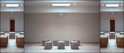 Cutting these stones must be akin to throwing clay upon the potter's wheel and forming something of it. This process includes recognition and acceptance of the unforeseen, along with the good sense to incorporate the "wabi" rather than erase it. Finally, it is the artist's sensitivity to each stone's natural variations in color and texture - and his acceptance and incorporation of the unpredictable - that distinguish these enormous sculptures, despite the overlay of an organizing principle that points elsewhere. Born in Dusseldorf in 1938, the artist now lives in London, and works mainly in three different European quarries, using each as a studio: Tampere, Finland; in Vigo, Spain; and in Vire, France, from which the majority of the stones in this exhibition originated. The exhibition is comprised of stone works created over the past ten years. |