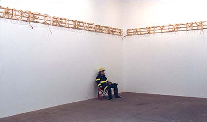 has been ominously rigged in live fireworks high on the gallery walls. (Plus: an on-duty NYFD fireman preventing potential ignition.)