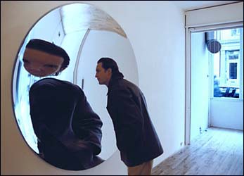 In an interview with Gregor Muir, the artist described his concave mirror sculpture as a "machine for generating strangeness. ...at a certain point you lose all perception of space." Not to mention losing one's head.