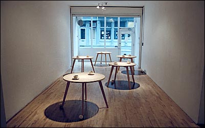 two cups of coffee on each table, two mechanical gizmo-balls rolling and bumping in the painted shadows...at
