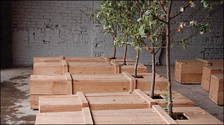 One hundred simple wooden coffins, each with a fruit tree growing out of the opening where one expects to see the face of the dead...