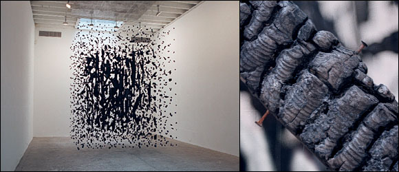is the centerpiece of this exhibition. Presented as her featured work in the 1997 Turner Prize Exhibition at the Tate Gallery in London, this installation is constructed from the charred remains of a Texas church that was struck by lightning. The artist had arrived in Texas for her Spring 1997 residency at ArtPace in San Antonio when she heard about an electrical storm that had destroyed a wooden church. "I went down and asked the Baptist minister if I could have the charcoal to make a charcoal drawing - which is what I consider this to be," she told the critic Louisa Buck. "I like the way that all the emotion of religion and the drama of lighting can be distilled into a very simple, quiet piece where all I'm doing is presenting the charcoal..."