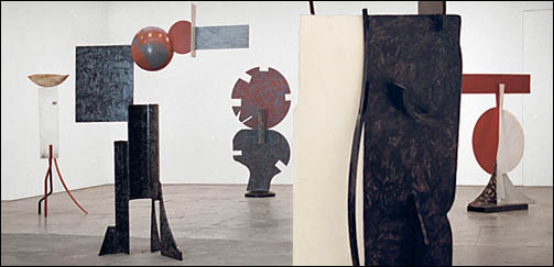 left to right: Tanktotem IX, 1960; Zig V,1961; Dida's Circle on a Fungus,1961; Black White Forward,1961; Circle IV,1962. "I never conceived of myself as anything other than a painter because my work came right through the raised surface, and color and objects applied to the surface... Gradually the canvas became the base, and the painting was a sculpture. I have never required any separation except one element of dimension." |