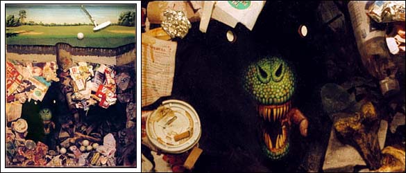 Envirotex, digitized photograph, trash, oil paint, Astroturf, golf ball, golf club, soil, cast plastic human femur on wood. 40x32x4.5 inches