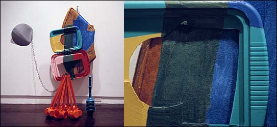 acrylic & oil paints, couch cushions, plastic container lids, shoe laces, hardware, chain, plastic scoop and toilet plunger, flashing.