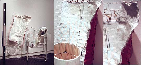 acrylic & oil paints, metal stud, angle iron, plastic mesh, paper with plaster & celluclay, lampshade, styrofoam, pillow, plastic & metal furniture, newspaper, electric cable ties, 4 coat hooks.