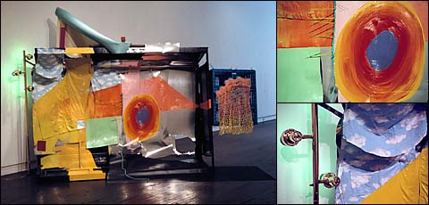 acrylic & oil paints, truck cover, cloud pajamas, plastic electrical ties, rope, hardware, flashing, shoe laces, yarn, plastic crates, linoleum, lamp, 3 green bulbs, lumber, rubber mat.