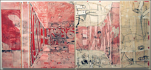 | Suzanne McClelland Enoughenough 1997-98 absorbent ground, enamel, acrylic, polymer emulsion, conte, charcoal on canvas 2 panels 75x184 in. overall.