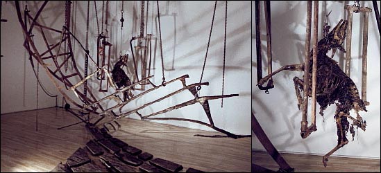 1997 The centerpiece of this installation is a deer carcass that the artist found on the road near her farm in upstate New York and then suspended in clear resin. Hung from the ceiling by chain link, the deer is surrounded by wood and steel cow stanchions, with quarry stones on the floor.