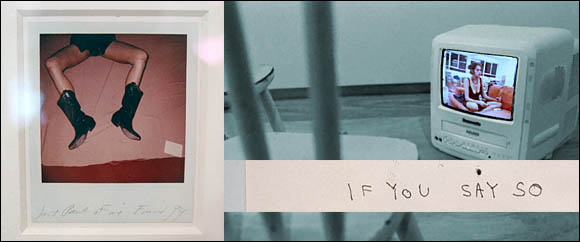 right: "The Interview" 1999, video, monitor, two chairs, two pair slippers (detail)