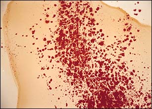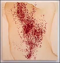 While this appears to be a random "splatter" painting in fact the artist has applied each spot individually to the still-wet shellac, allowing the pigment to fuse with the surface.
