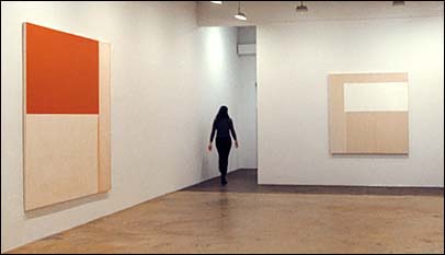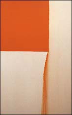 Exposed Painting, Cadmium Orange | Exposed Painting, Titanium White both oil on canvas 1996 The wispy vertical trail, which is a key to how Innes works, resulted when the orange paint was partially dissolved with turpentine. " It took me a long time to realize that the unpainted areas were the most important. That was where the eye was drawn." Reportedly, the canvases begin entirely covered by a monochrome field, most of which is edited away. |