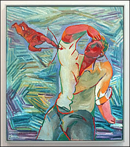In contrast, the other paintings in this exhibition are quieter images in which a single stationary figure dominates the composition. Chia's modest heroes earn their status my meeting the challenges posed by day to day existence. Titles like Mother and Restless Child, Sudden Occurence, and Sudden Birth, evoke ordinary occurrences that happen at any time in history and are common to us all. -Shafrazi Gallery |