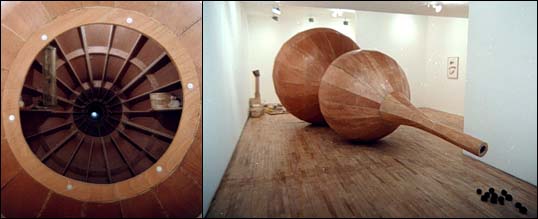 The Pharmacy 1995 Is it a giant gland excreting black nuggets? No. It's a gourd, modeled after the kind of gourd Taoist priests used as a satchel to carry medicines. In and around this structure Huang has placed a variety of herbal medicines, alongside objects of no apparent medicinal value. It is not clear what is intended here, but the piece is oddly engaging anyway. Its size is hugely overblown for the space, while its interior structure resembles the framework of a boat hull. |