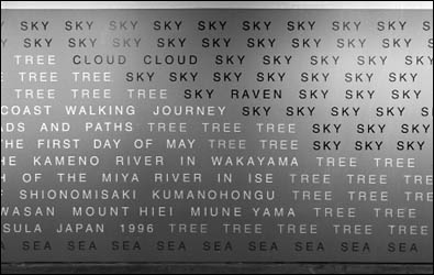 Hamish Fulton detail: A 21 DAY COAST TO COAST WALKING JOURNEY ON ROADS AND PATHS STARTING ON THE FIRST DAY OF MAY FROM THE MOUTH OF THE KAMENO RIVER IN WAKAYAMA ENDING AT THE MOUTH OF THE MIYA RIVER IN ISE TRAVELLING BY WAY OF SHIONOMISAKI KUMANOHONGU SHAKAGATAKE OMINE MIWASAN MOUNT HIEI MIUNE YAMA KII PENINSULA JAPAN 1996 oil based paint and vinyl lettering on wall, dimensions variable (10ft x 52ft) at John Weber Gallery, 529 W. 20th St. (Chelsea) Nov 24 - Dec 23 '98Continuing reports from a life of hiking as performance art...