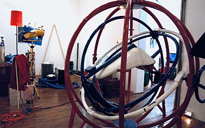 DEVIATIONS IN SPACE, VARIOUSVIRGINS is a single, large work that utilizes the entire space of the gallery. The central element is a Spaceball, originally designed to create a sensation of suspended gravity through multi-directional rotation within a sphere. |