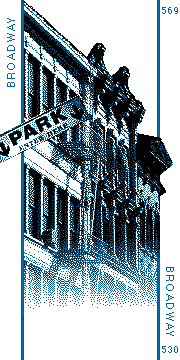 | Broadway circa 1855 was the greatest shopping street in America. Windowshopping was born on Broadway south of Houston: the area's cast-iron buildings held America's first large plate-glass windows. It was a riot of variety houses, music halls, department stores, and elegant hotels. Showman P.T. Barnum exhibited a fetching female impersonator at #537, now an "Everything Under $10.95" discount store. |