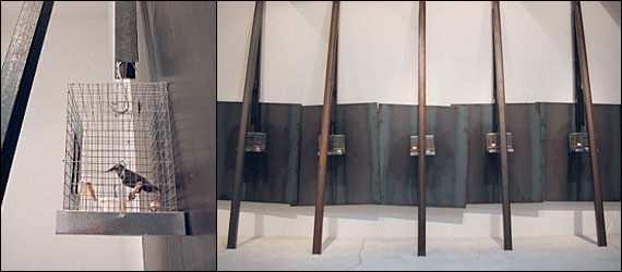 Each cage holds a live, wild starling. The metaphor continues to elaborate and illustrate itself, arriving at confinement of the natural in a post-industrial age.