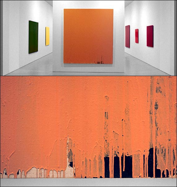 It is impossible to represent adequately here the subtlety and beauty of Marioni's color. The paintings must be seen; the room must be experienced. These are finely-tuned, aesthetically complete objects in which color, form and surface texture work together to create an almost oriental, deeply meditative form of balanced quiet. The colors shift with changing light, and the glossy surface reflects an emphemeral sheen that at times includes the viewer's own silhouette. Each painting bears the title of its color: Blue Painting, Green Painting, Orange Painting... These works are "minimal" only in the sense that their subject is color. They lack for nothing though they offer no overt literary, political or poetic content. Their poetry is in perception and the natural satisfaction that vision unmitigated sometimes provides.