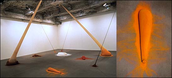 The scent of cloves, turmeric, and pepper... Neto has taken silk stockings and filled them with spice: tie a knot, fill the sack, throw it on the ground. Fragrant biomorphs hang like teardrops from the concrete beams, exuding a rich aroma recalling Colonialism, the Body, plastic elastic - nevermind. The titles are onomonopoeias, "Puff", "Paff", "Poff" each describe the sound of the falling bag. In order to fully appreciate the olfactory impact of this sculptural installation, sniff a jar of spices while staring at this image. |