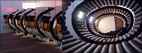 LOT/EK Architecture TV Tank at Deitch Projects, 78 Grand St. Oct 24 - Nov 28 '98 A petroleum trailer tank has been transformed into a set of floating modules designed for lounging and watching television. The 35 foot aluminum tank was sliced into eight rings, each module then retrofitted with a liner of rubber tubing and a 13 inch color television equipped with cable and remote control. Viewers may occupy the once-hidden interior of the oil tank, now animated by the flicker of television light. LOT/EK is a partnership of Ada Tolla and Giuseppe Lignano, 1989 graduates of the Facolta di Architettura at the University of Naples. They are now living and working in New York. |