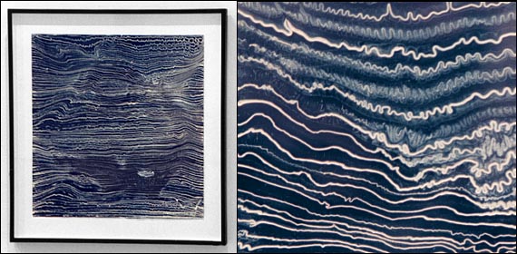Untitled, 1998"I create the long thin lines in these drawings one by one, by literally drawing out the rubber-based printer's ink. The lines are stretched and arranged side by side, with the (pointless) desire in mind to make them perfectly even and straight. The process is compulsive, but the disruptions I generate are more interesting and seductive. I like the contradiction inherent in a drawing which is produced by hand, in a simple, time-consuming process, but which resembles a graph made by a machine. For me this contradiction is evident in any human attempt to measure something un-measurable (like a lie, or a tremor)." -M.M. |
