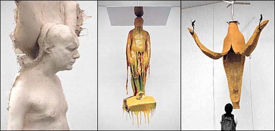 Center: The Invisible Man, 1996stainless steel,RTV polyurethane - height 93 in. Left: The Great Escape, 1998 rubber and stainless steel - height 146 in.