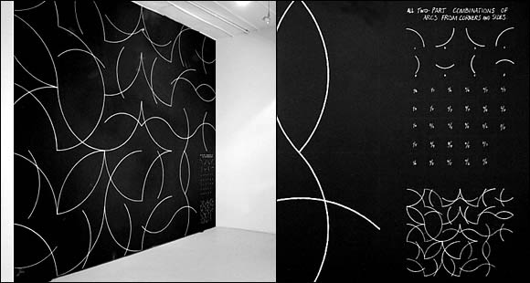 All Two-Part Combinations of Arcs from Corners and Sides, 1998 Wall drawing #842, white crayon, black pencil grid, black wall 14x18 ft. Drawn by Russell Calabrese and Anthony Sansotta.This small group show features work created by systemic means. It questions both authorship and the meaning conveyed by geometric variation, generative analysis, and probability. A certain austere beauty emerges from the results, as applied systems point beyond the conceptual to the underlying symmetries of the natural world. This opening out is decidedly odd, like looking in the mirror only to find an image there that is recognizable but fragmented. I see your face as a puzzle-piece... The conceptual veracity of Arcs is underscored by the fact that while LeWitt is the 'author' his hand is not in this version: it was drawn by others. |