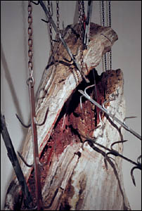Gillian Jagger Of the Hunt, 1998 (detail) treetrunk, meathooks and chains According to the artist: "It carries an overtone of The Assyrian Lion Hunt that I visited at the British Museum. It implies unforgiving, relentless accusation: can we ever reverse direction and address our guilt?"at Phyllis Kind 136 Greene St Mar 13-Apr 24 '99 galleryhopping winter99 |