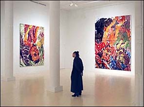 These canvases were painted under foot, on the ground. Occasional footprints mark the artist's movement across the surface of the picture. The figures are painted as you see them; the canvas is not turned upside-down at the end.