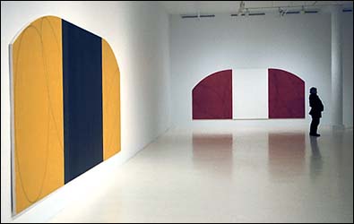 Large heraldic abstractions explore oppositions: square-circle, flat-perspectival. The colors are earthy and warm. The surface is sensual.