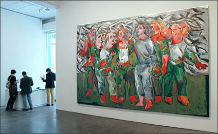 Two recently completed paintings in this exhibition depict several figures, each engaged in some activity. On an epic scale, the figures are autobiographical fragments that make up a larger story, things familiar from Chia's life experience such as working, traveling, contemplating, etc... He is interested in the way that painting can portray the existential human condition by showing an instantaneous chronology comprised of all events of one's life coexisting at the same time. -Shafrazi Gallery |