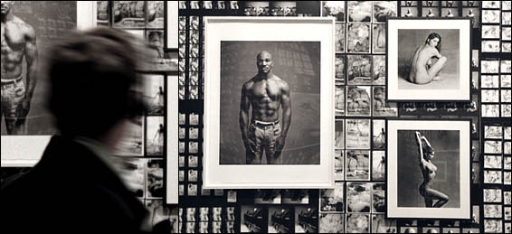 | The gallery is wallpapered from floor to ceiling with raw contact sheets, complete with editing marks and crossouts. As for subject matter: fashion, nudes and celebrity portraiture outnumber elephants, peasants and Sumo wrestlers by about twenty to one. Framed images are scattered here and there. The visual profusion underscores what Benjamin observed and Warhol embraced: ours is the age of mechanical reproduction. Repetition is the name of the game. |