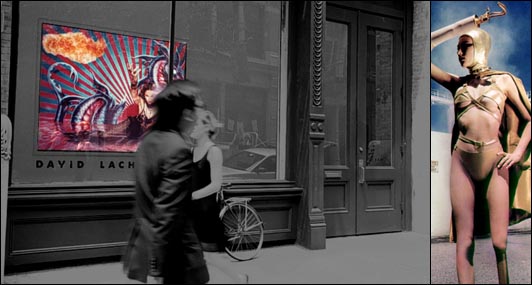 "David LaChapelle is a photographer who tends to create his own visionary world, rather than reproduce what's visible in the world. ...Performance obliterates banality, just like Drew Barrymore's breasts can become grapefruit halves with a cherry; we hear the distant echoes of Lewis Carroll; eat me, drink me, big becomes small; the Tour Eiffel becomes a phallus (and vice versa), (meaning and lack of meaning mingle and compare.) This is the flow of the metropolis, of the great city life, fixed within its peremptory unreality substituting the known realities of camera shots." - Renato Nicolini, catalog excerpt. Which only goes to prove that when it comes to discussing commercial fantasy photography, one shouldn't try to say too much. |