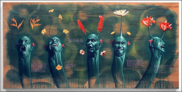 "THE FIVE SAGES" 1998 acrylic, oil and pencil on wood, 72 x 84 x 3.5 in |