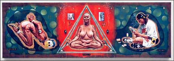 acrylic, oil, pencil and photographs on wood, 48 x 144 x 3.25 in