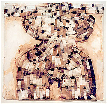 Al and Beck Hansen "Playing with Matches" Fluxus-man Al teams with his grandson Beck (that's the one) in a kind of whole-career survey. Beck made a few videos for the occasion. Highlights are Al's hershey-wrapper collages of his signature fertility figure/buxom broad, who appears again and again. Here, she's constructed of cigarette butts. She's more than a concept, she's an obsession...