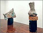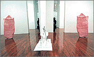 3 part sculpture installation: plaster, pink paint, gauze; suitcase, plaster, paint, gauze;suitcase, cardboard box, plaster, paint, gauze on the left: a mirror by Michelangelo Pistoletto
